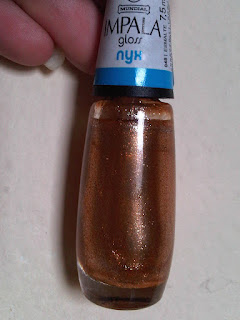E o terceiro é o Nyx da coleção Impala Gloss. Ele é um marrom acobreado com microrilhinhos. Eu particularmente adoro esmaltes assim, então tenho vários =D